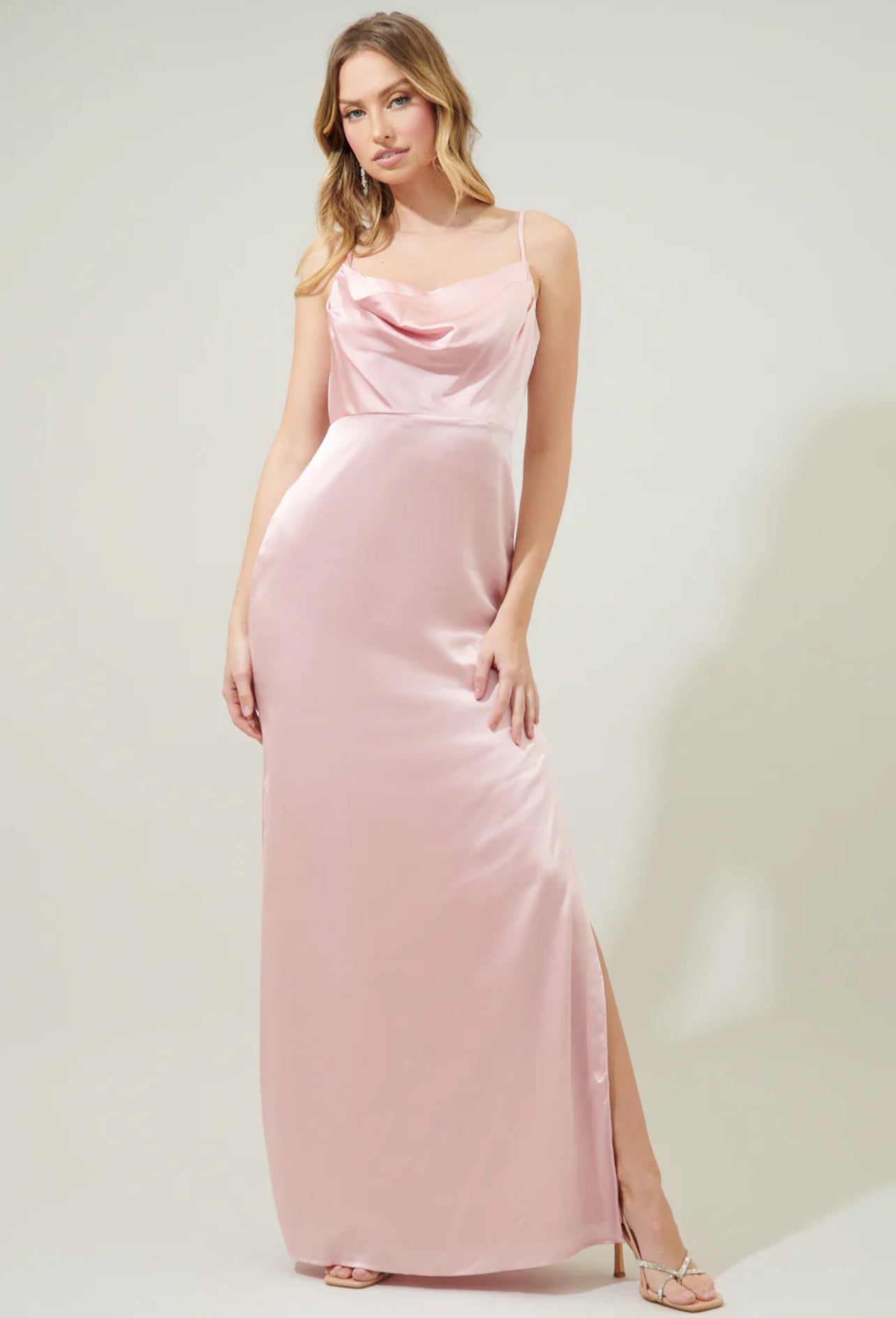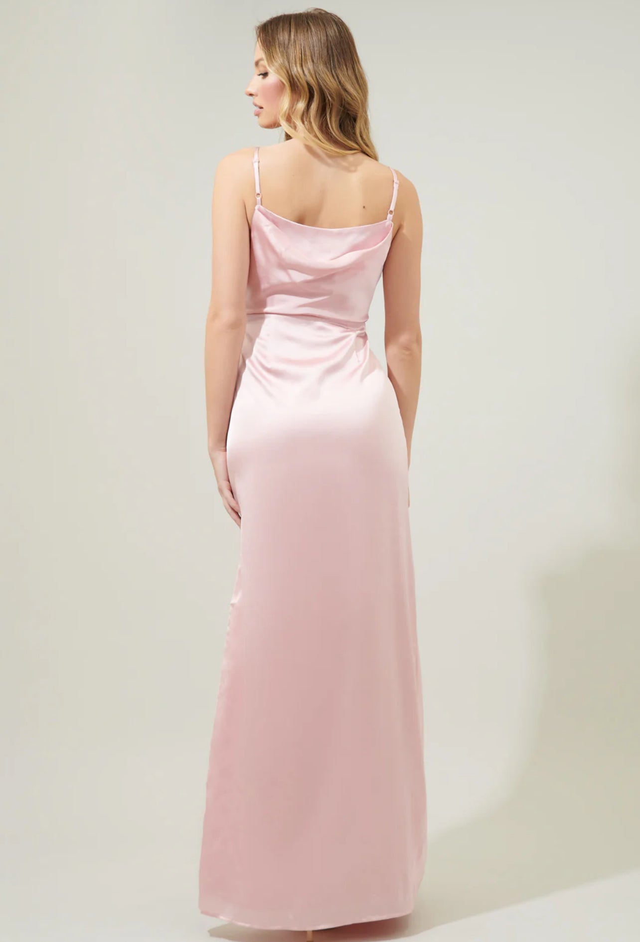 A timeless showstopper, the Charisma Maxi Dress features a lustrous satin that constructs a flattering cowl neckline which drapes throughout a shapely bodice. A high waist sits atop a sleek maxi skirt creating a praising hourglass shape, and features a charming side slit.