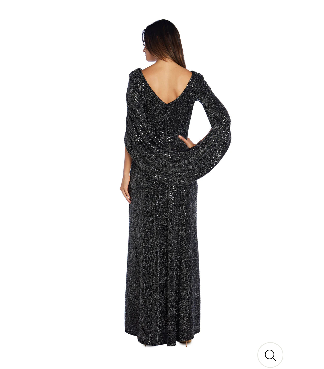 A gown fit for the red carpet. A full-length column dress fits the waist and hips perfectly, falling straight to the floor for a sleek and slender silhouette. A high neckline sits wide on the shoulders to flatter the décolletage. 3/4 sleeves flare into wide sleeves, connecting at the back in a draped shawl style, with a low V-cut back to show off the shoulders. Sparkle all over with metallic fabric studded with sequins.