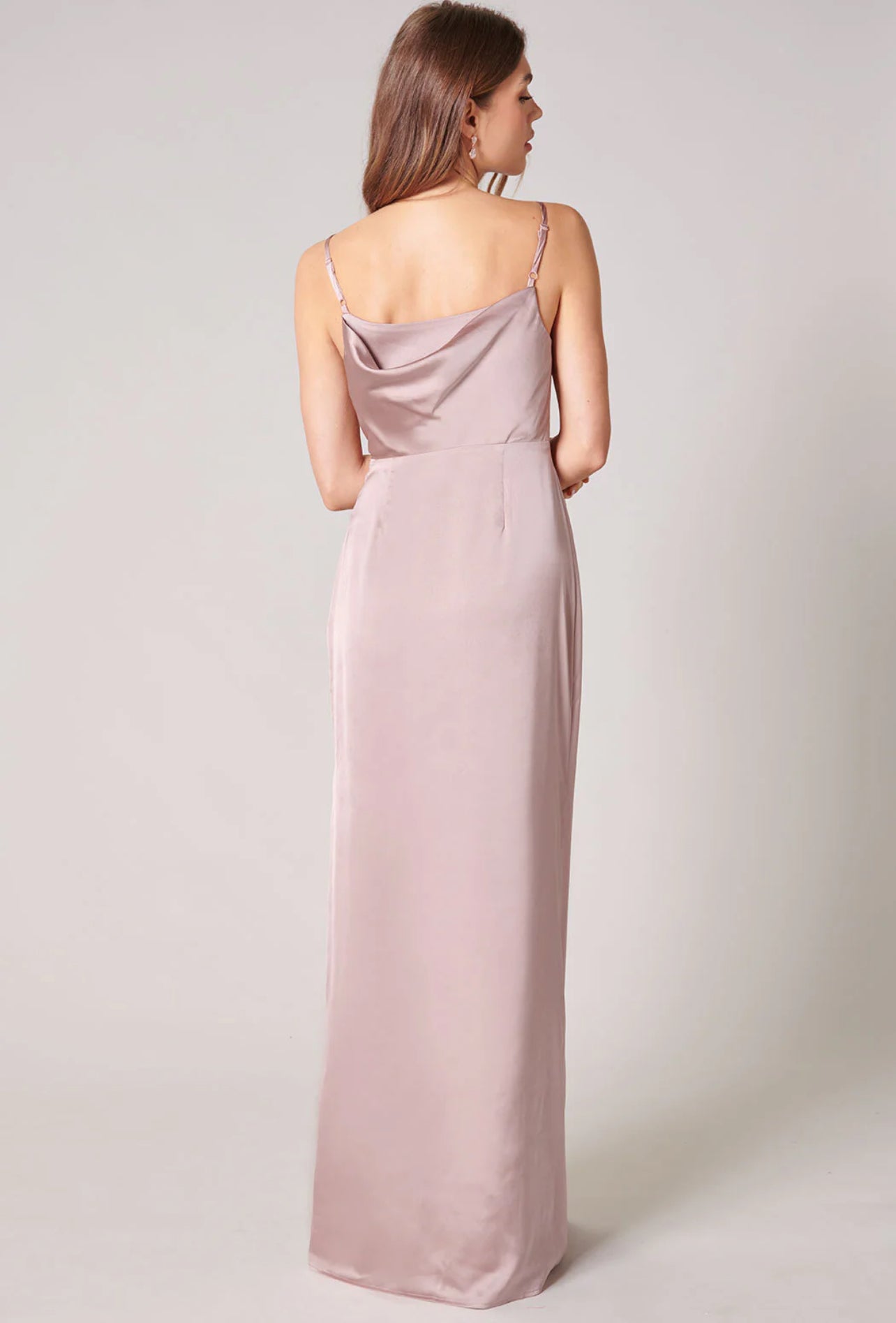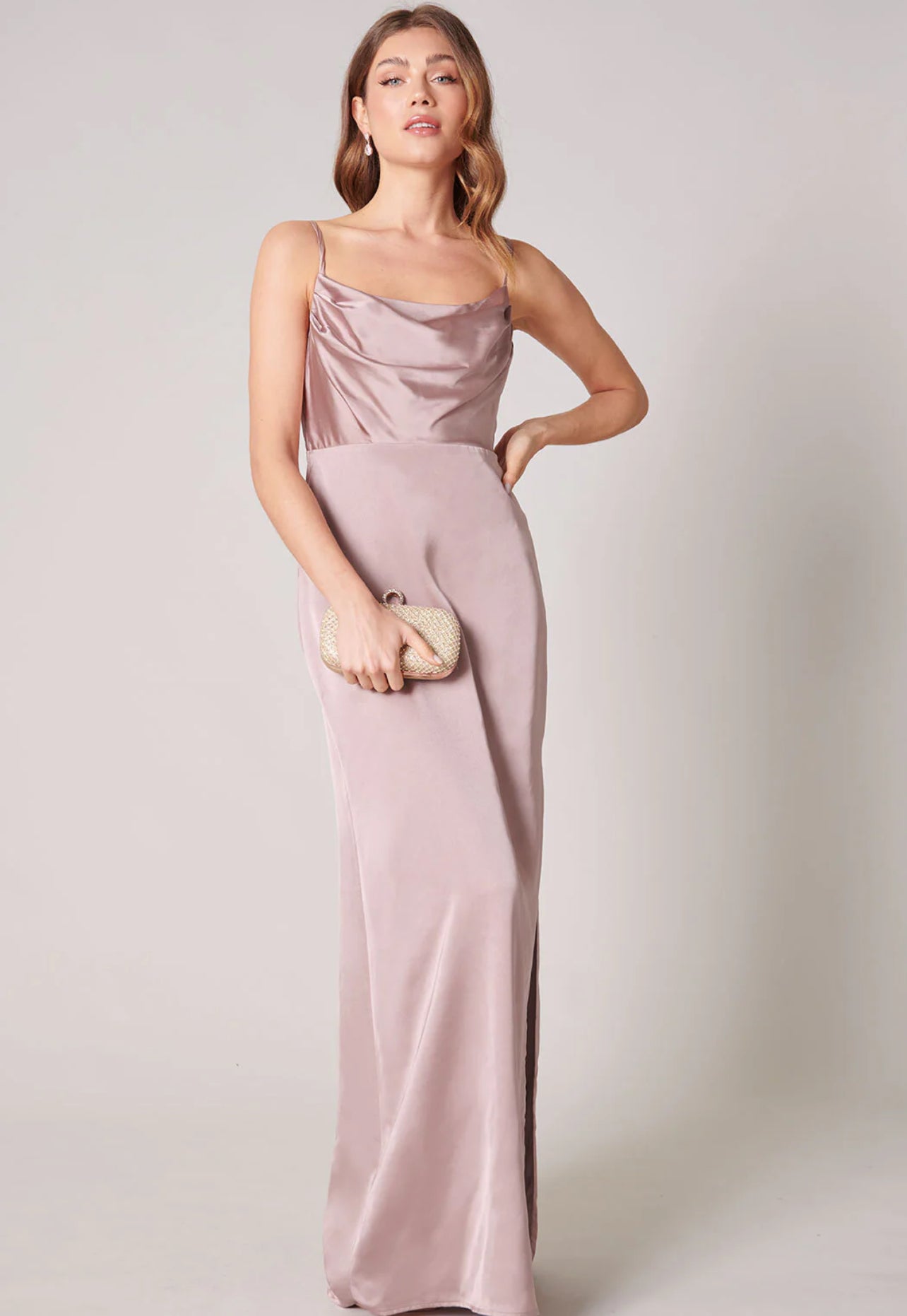 A timeless showstopper, the Charisma Maxi Dress features a lustrous satin that constructs a flattering cowl neckline which drapes throughout a shapely bodice. A high waist sits atop a sleek maxi skirt creating a praising hourglass shape, and features a charming side slit.